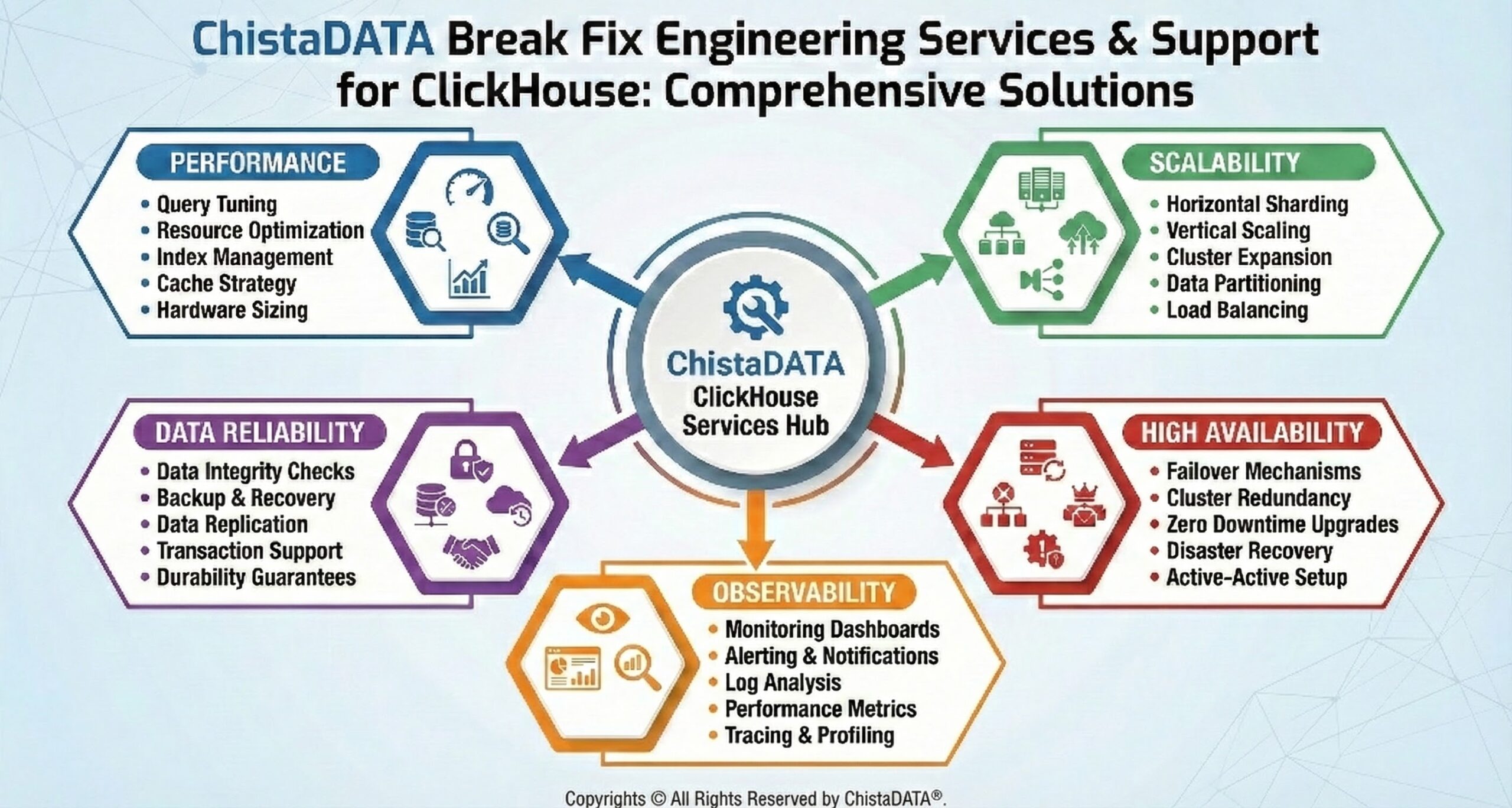 In today’s data-driven enterprise landscape, ClickHouse has emerged as a powerful columnar database management system renowned for its exceptional speed in processing analytical queries. As organizations increasingly rely on ClickHouse Support for mission-critical analytics workloads, the need for specialized engineering support becomes paramount. ChistaDATA Break Fix Engineering Services provide comprehensive technical expertise to address complex challenges in ClickHouse deployments, ensuring optimal performance, scalability, data reliability, high availability, and comprehensive observability.
