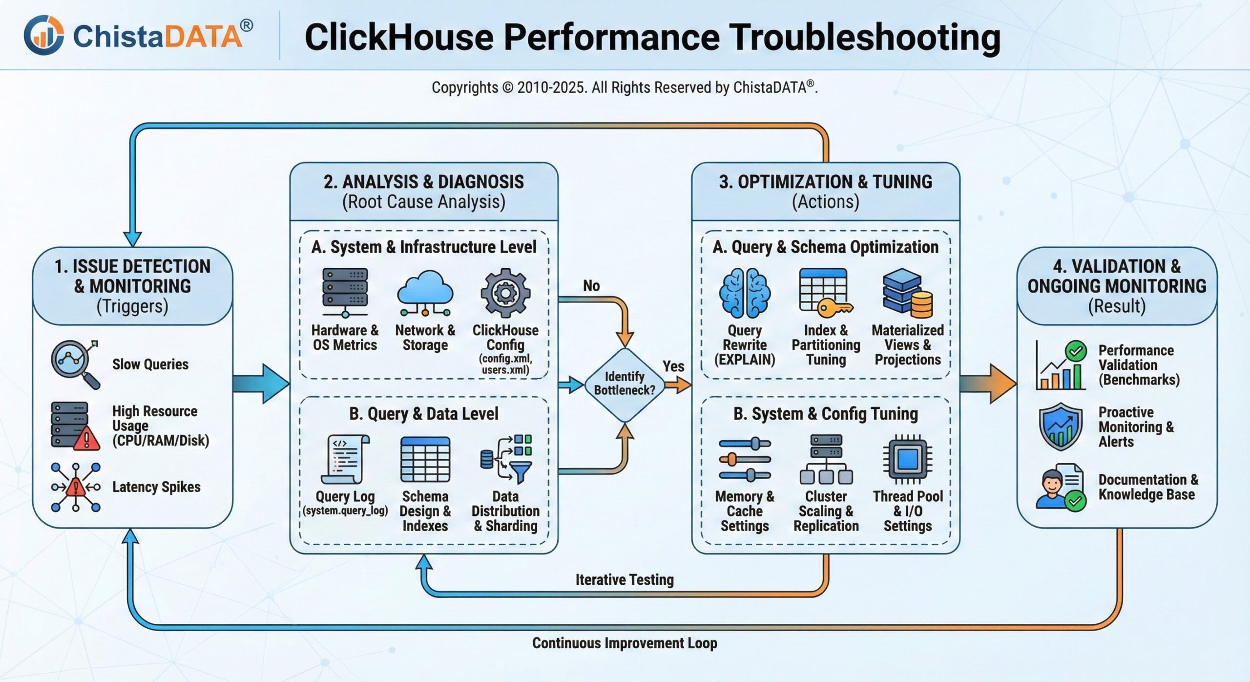 ClickHouse excels at delivering sub-second query responses over petabytes of data, making it ideal for real-time analytics, dashboards, and event-driven systems. However, harnessing its full potential requires more than just installation—it demands deep expertise in architecture, optimization, scalability, and reliability engineering. That’s where ChistaDATA comes in.